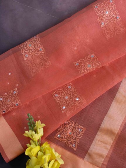 Banarasee Cotton Silk Kota Check Embroidered Buta & Mirror Work Dupatta-Peach