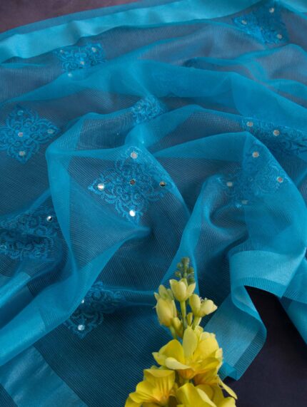 Banarasee Cotton Silk Kota Check Embroidered Buta & Mirror Work Dupatta-Blue