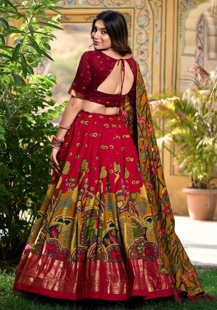 Red Kalamkari Print Tussar Silk Lehenga Set