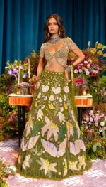 Witness the magical fusion embodied in our Olive Lehenga Set. Adorned with an olive green hue infused with golden accents, gleaming sequins, and elegant pearls, this ensemble is a visual delight. The mesmerizing patchwork created with fluid organzas and metallic georgettes adds to its charm. Complemented by a side dupatta and our signature blouse in a delightful combination of pink and olive tulle, adorned with shimmering sequins, luxurious metals, and sparkling crystals.