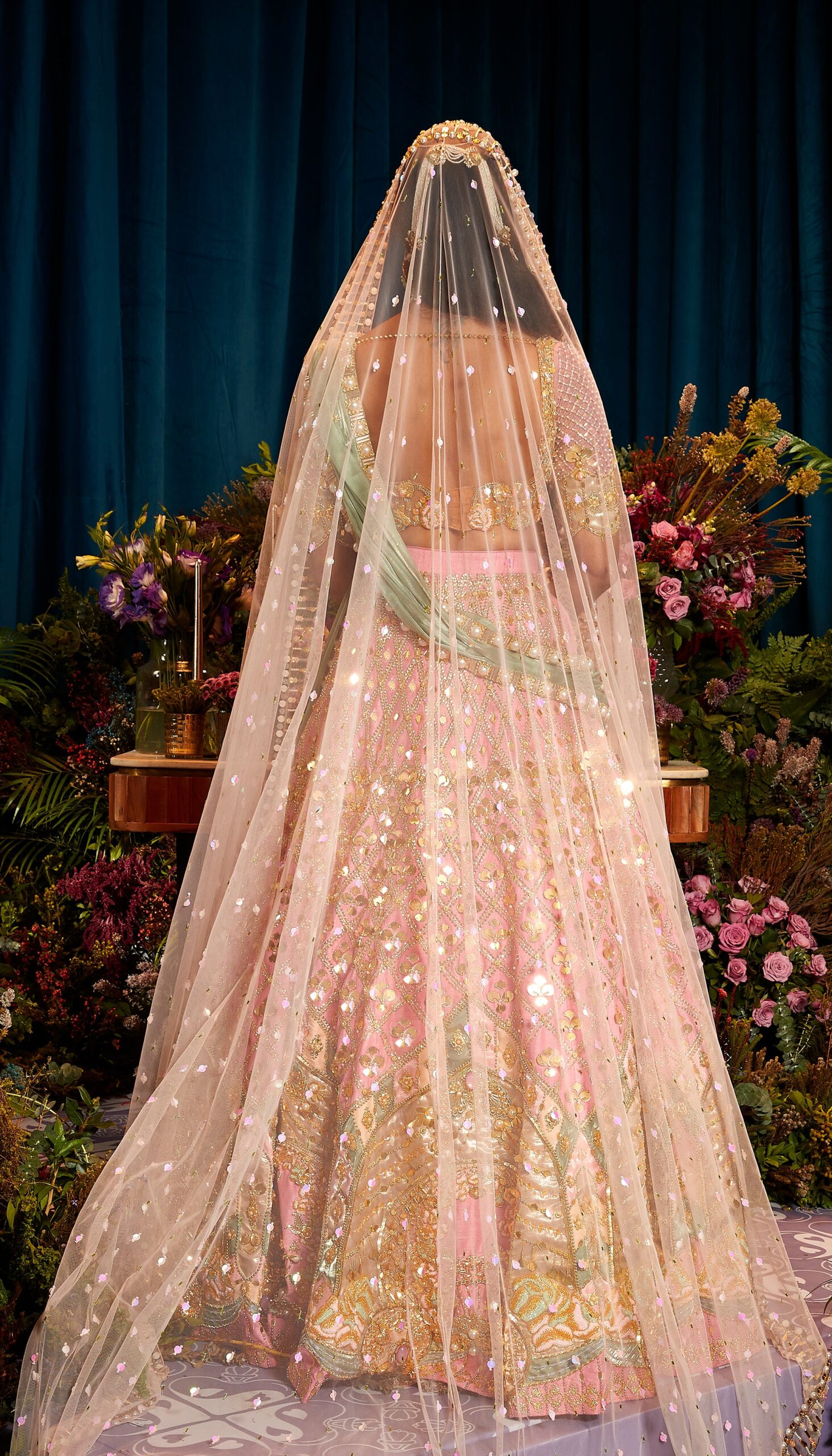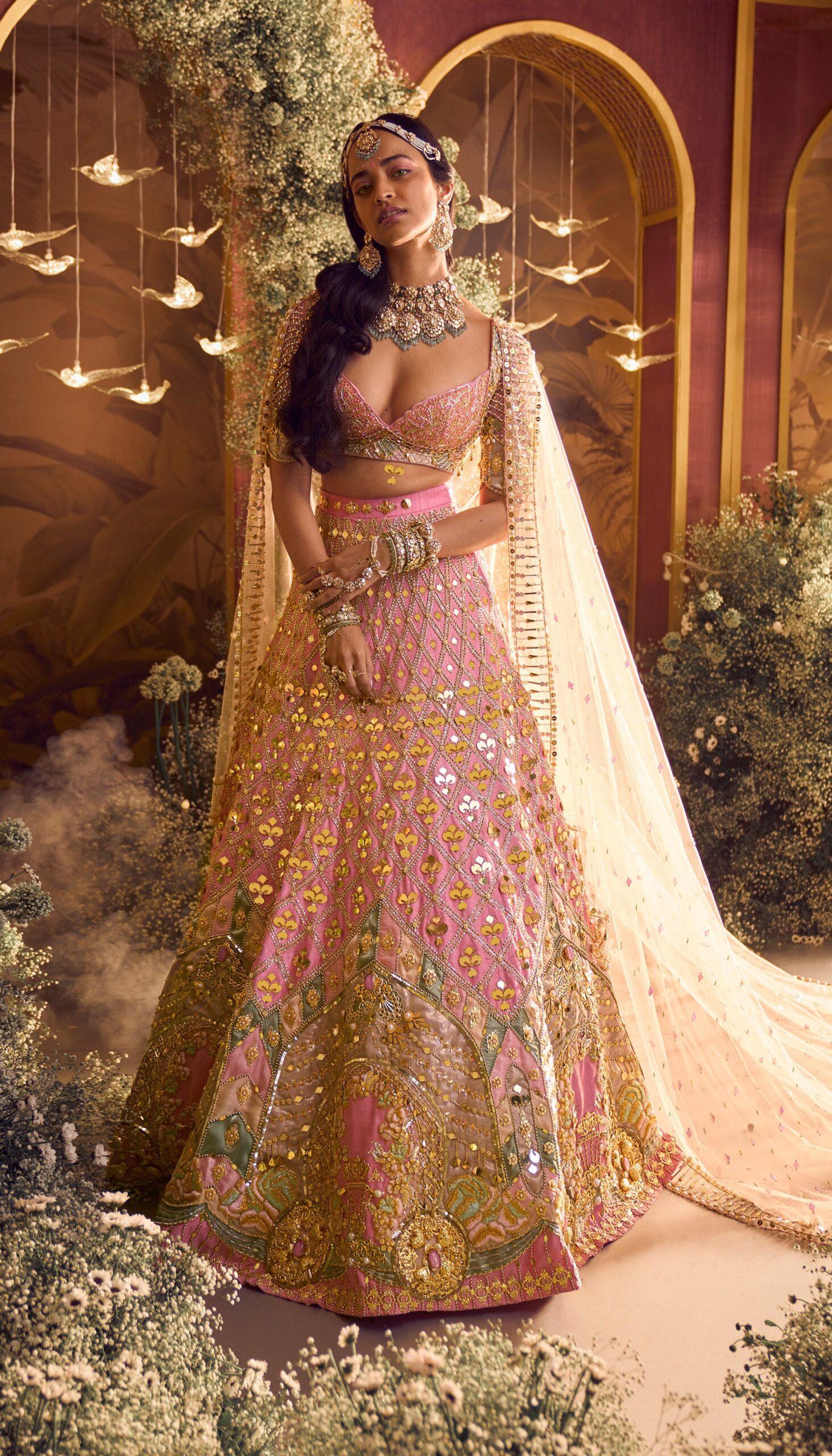Explore the Royal Carriage Bridal Lehenga Set, an opulent masterpiece embroidered with crystals, gold tassels, beads, and 3D floral motifs. Elevate it with custom initials for a personalized touch. Paired with a magenta blouse featuring delicate tassels and a signature Papa Don’t Preach bangle back. The ensemble is elegantly finished with embroidered magenta tulle and fluid organza dupattas.
