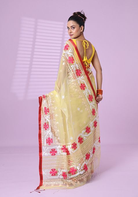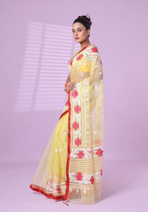 Banana Yellow Embroidered Muslin Saree Set – XSR43464