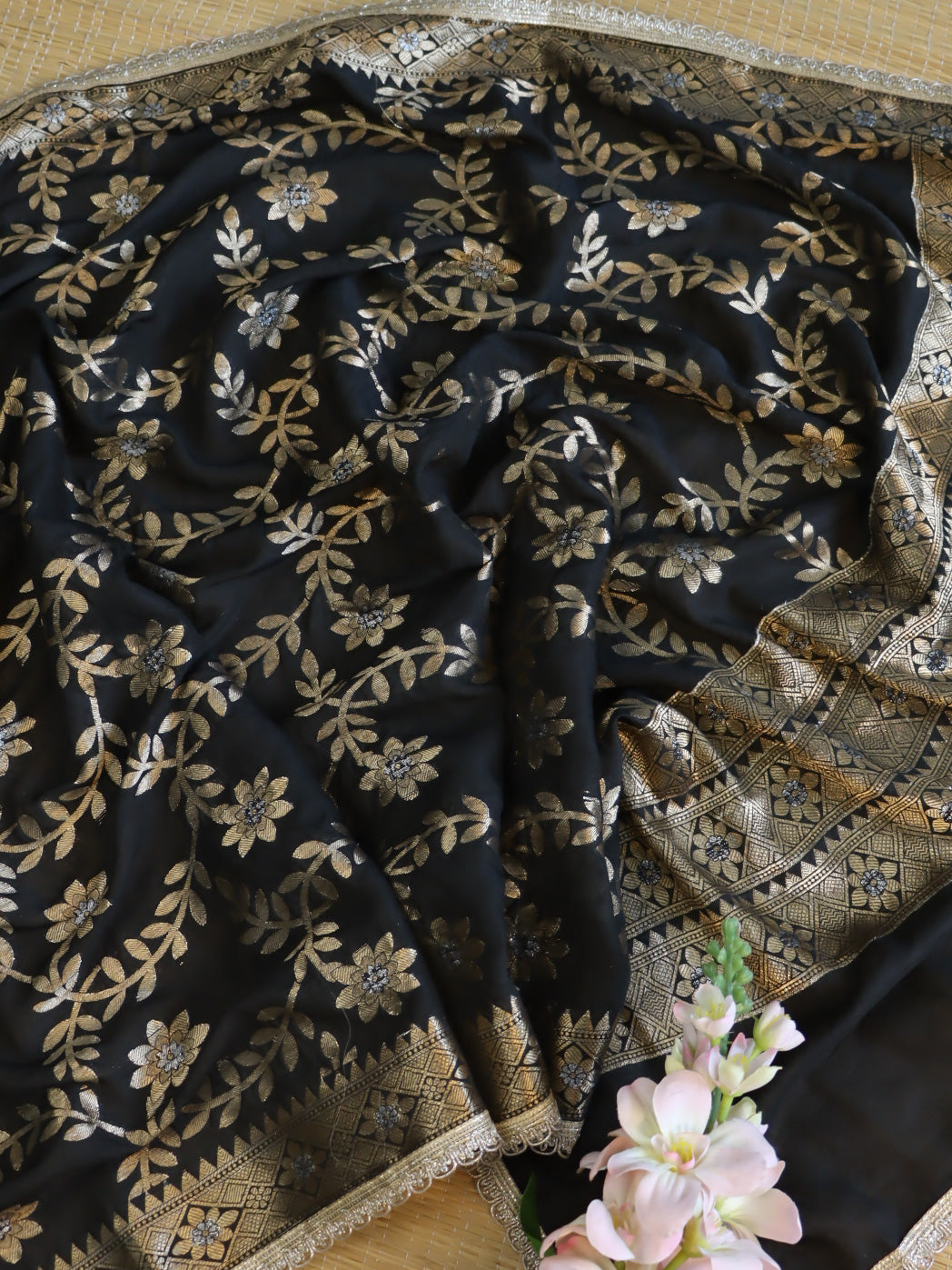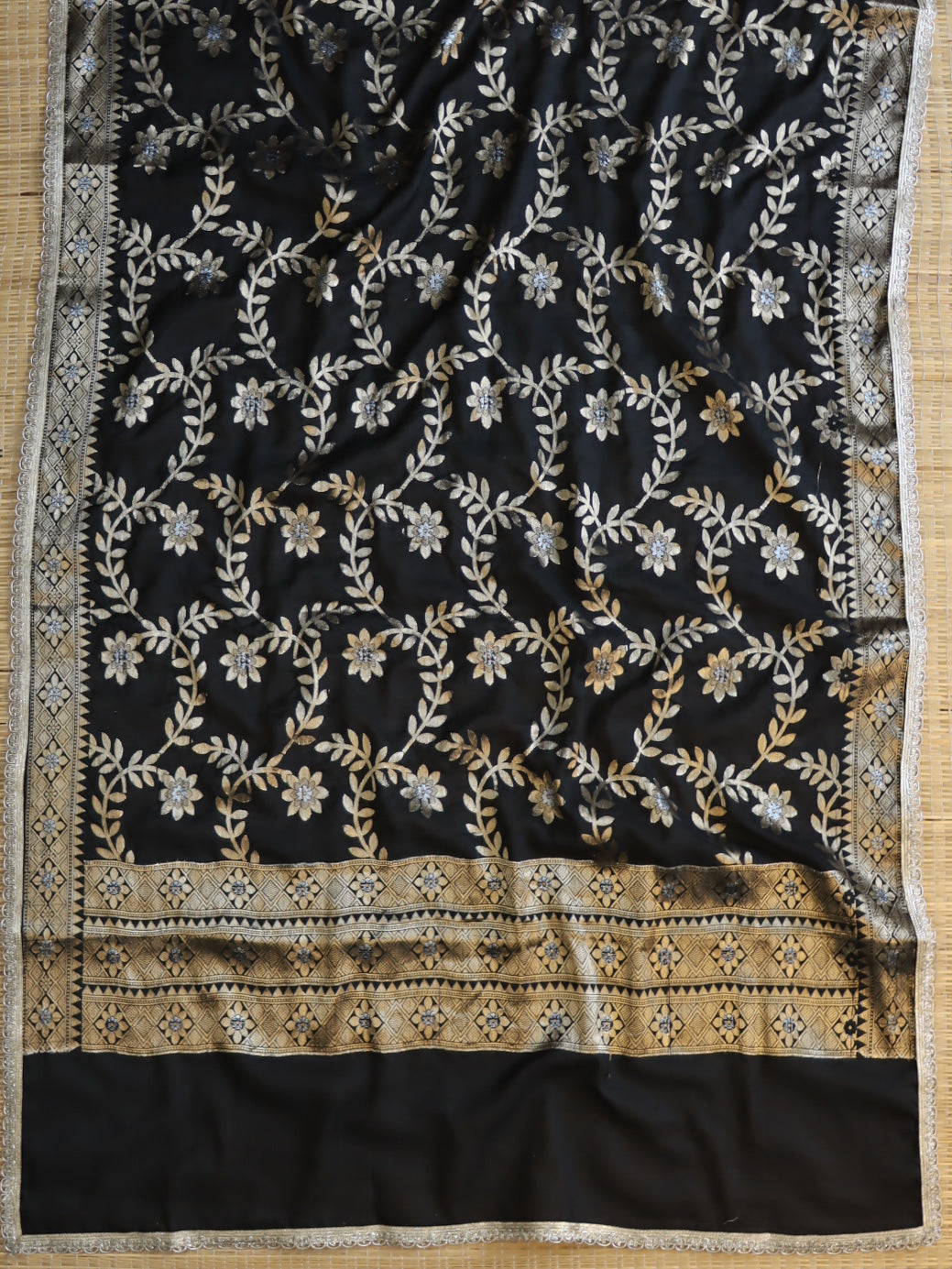 Banarasee Cotton Silk Dupatta With Zari Jaal Design & Lace-Black