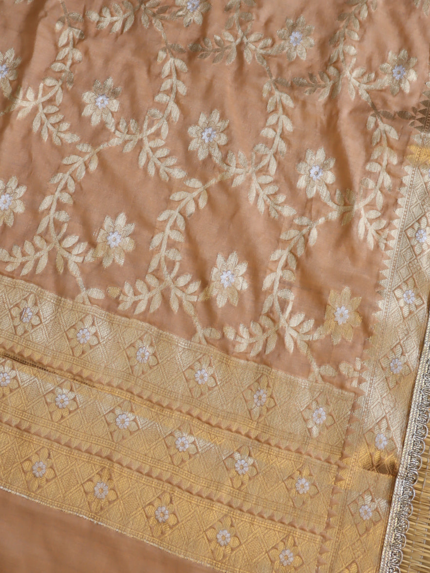 Banarasee Cotton Silk Dupatta With Zari Jaal Design & Lace-Peach