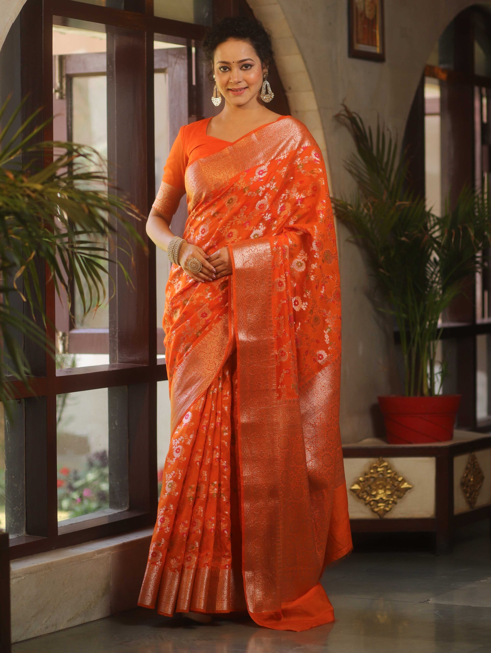 Home Sarees Banarasee Faux Georgette Saree With Gold Zari & Resham Jaal Work-Orange