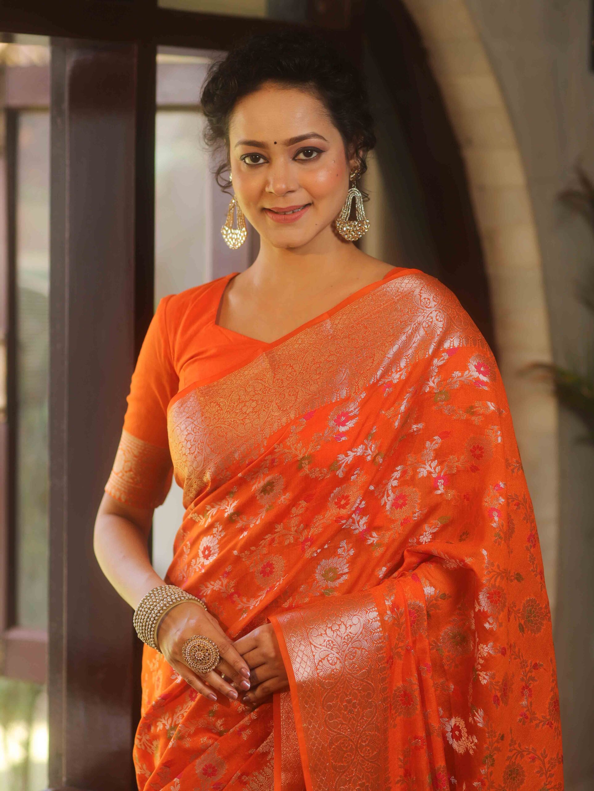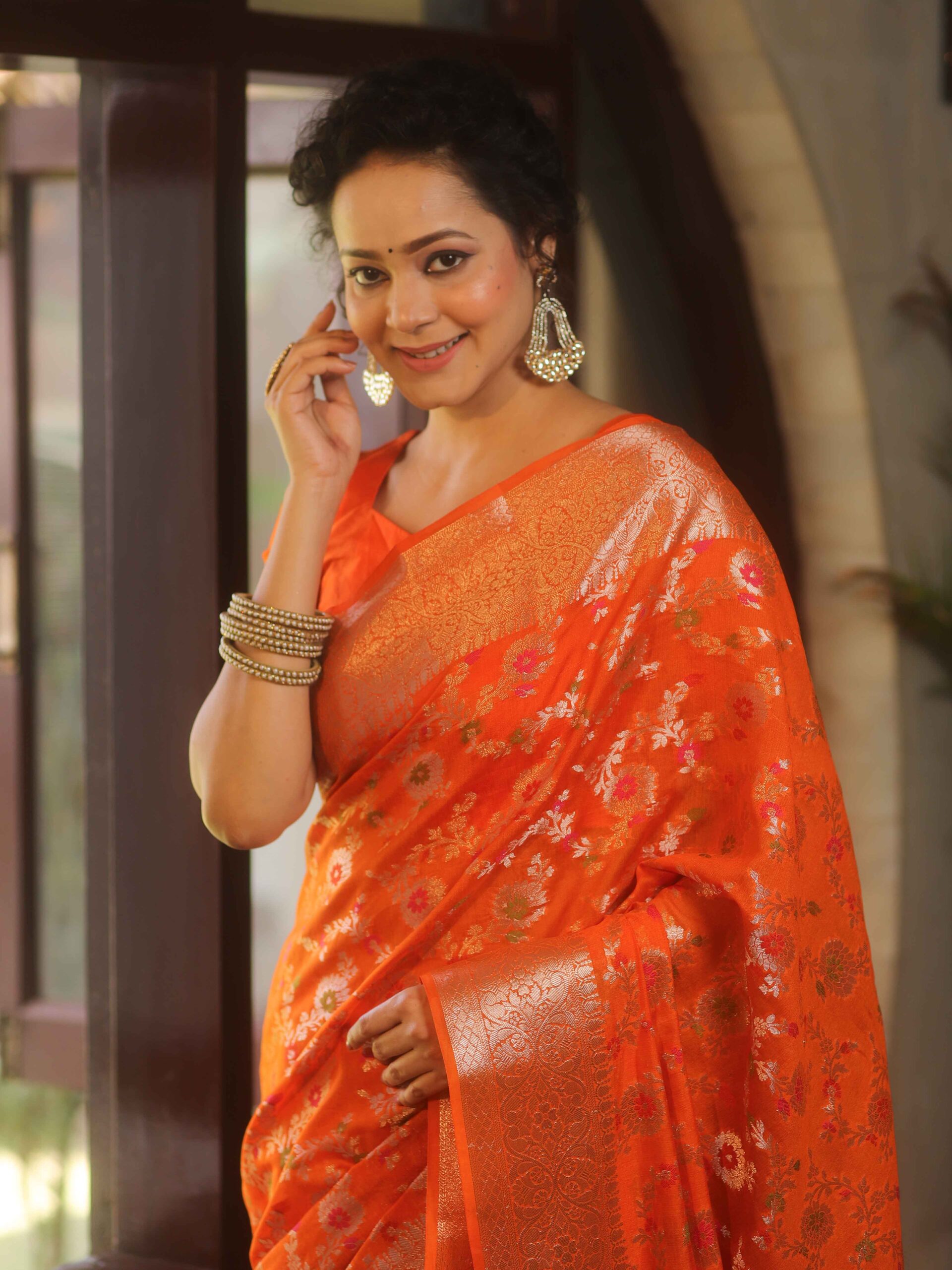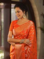 Be the first to review “Banarasee Faux Georgette Saree With Gold Zari & Resham Jaal Work-Orange” Cancel reply