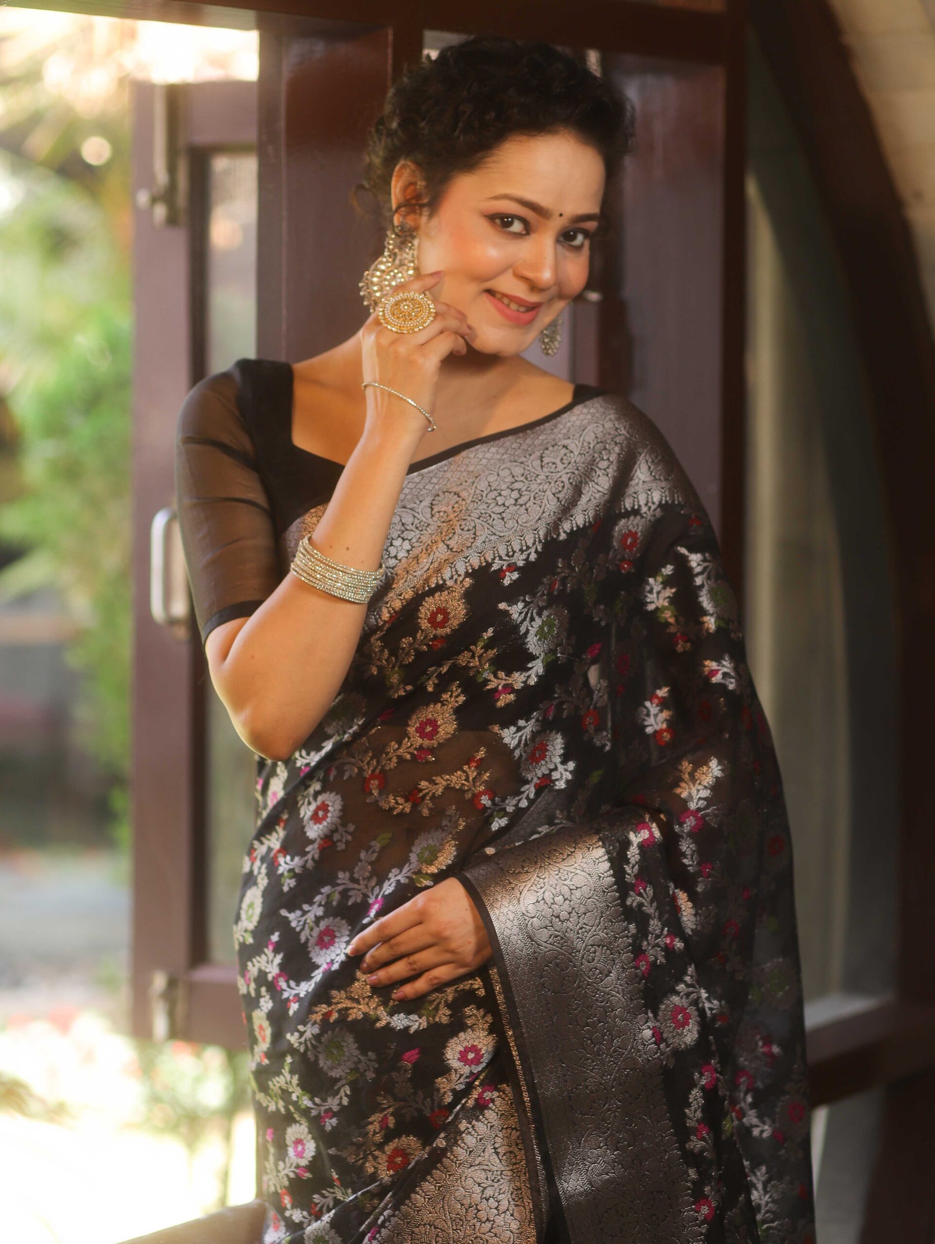 Banarasee Faux Georgette Saree With Sliver Zari & Resham Jaal Work-Black
