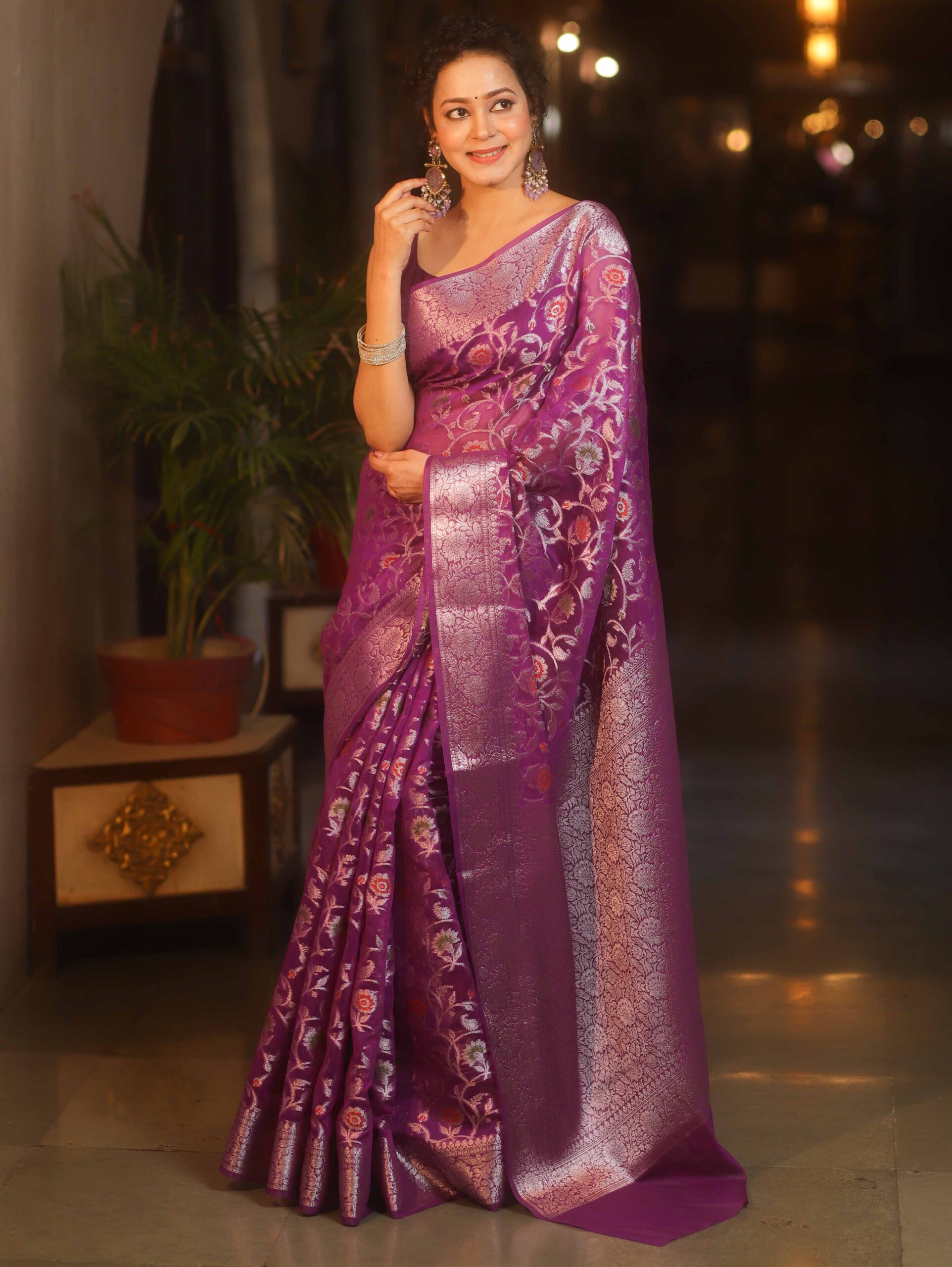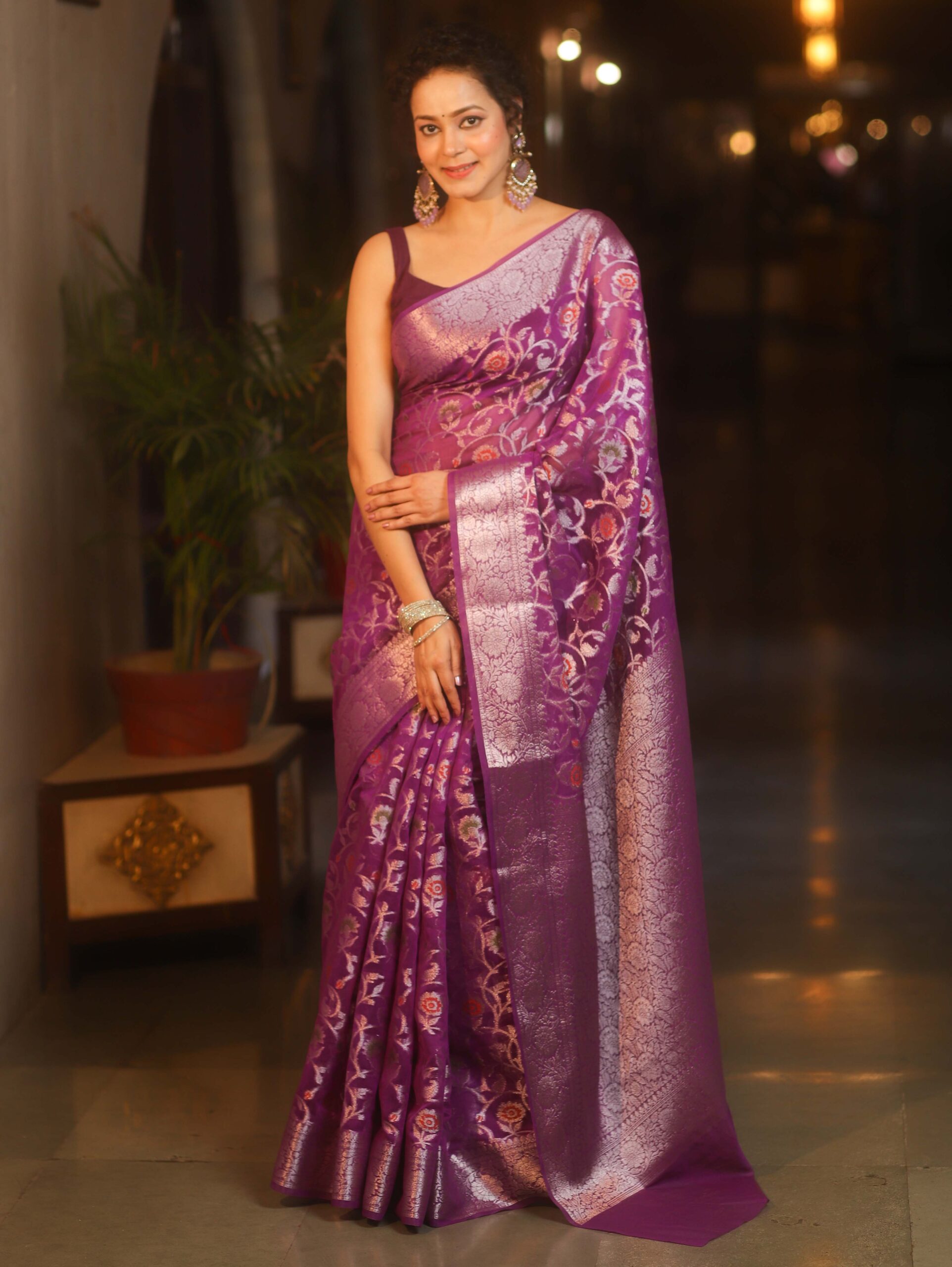 Banarasee Faux Georgette Saree With Sliver Zari & Resham Jaal Work-Violet