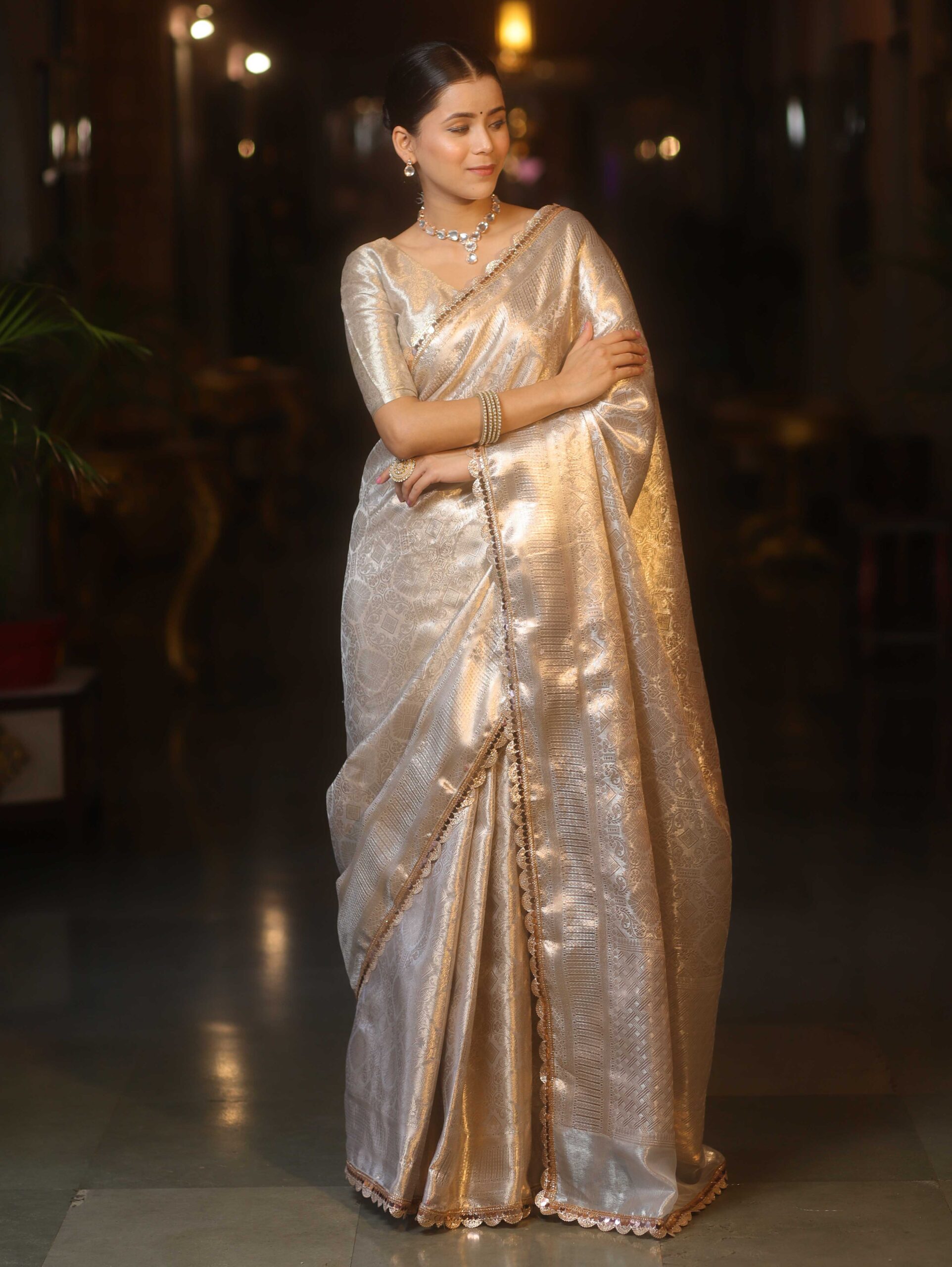Home Sarees Banarasee Handwoven Tissue Saree With Silver Zari Jaal Design & Lace-Silver