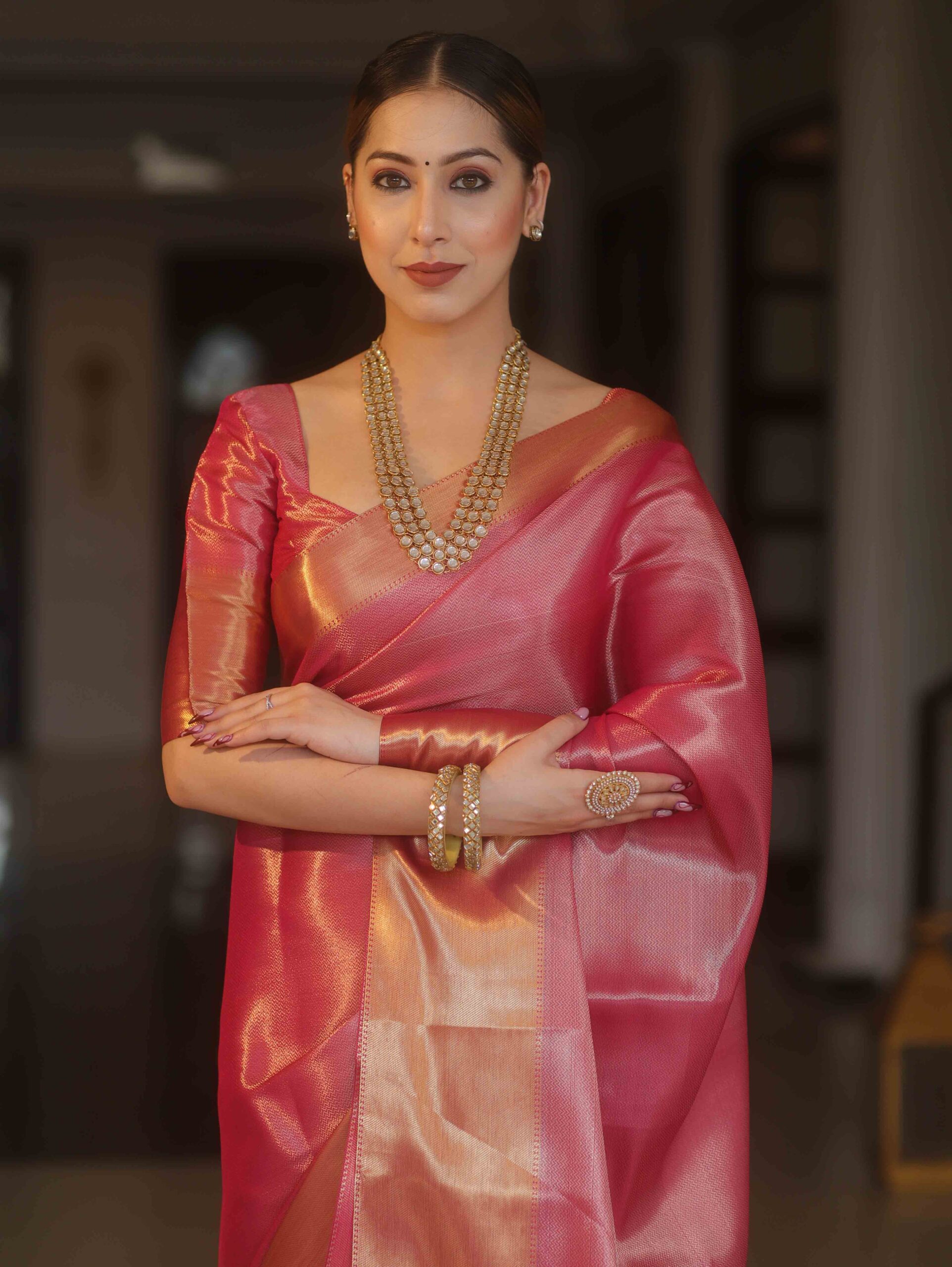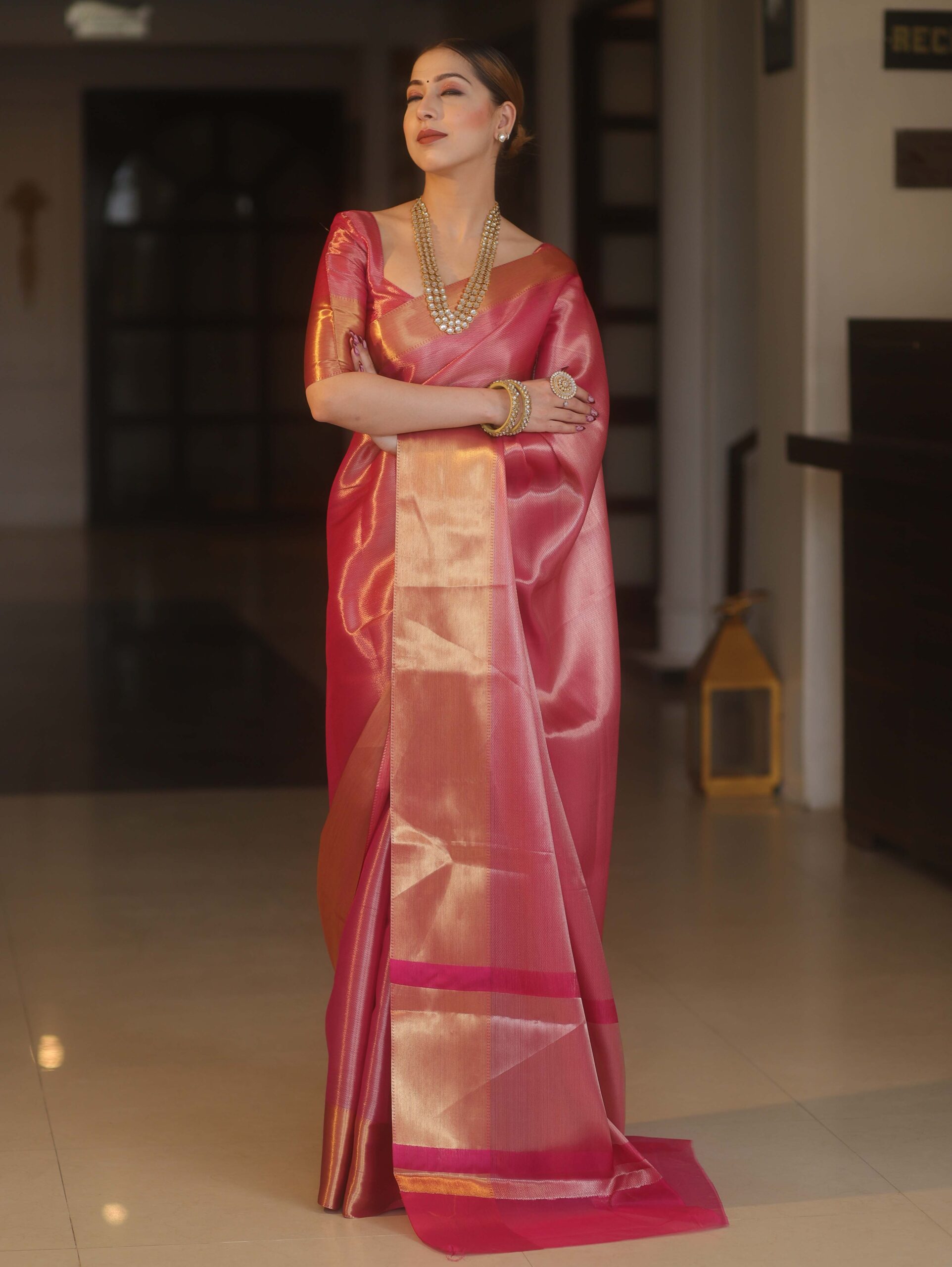 Banarasee Handwoven Tissue Zari Saree With Gold Broder-Pink