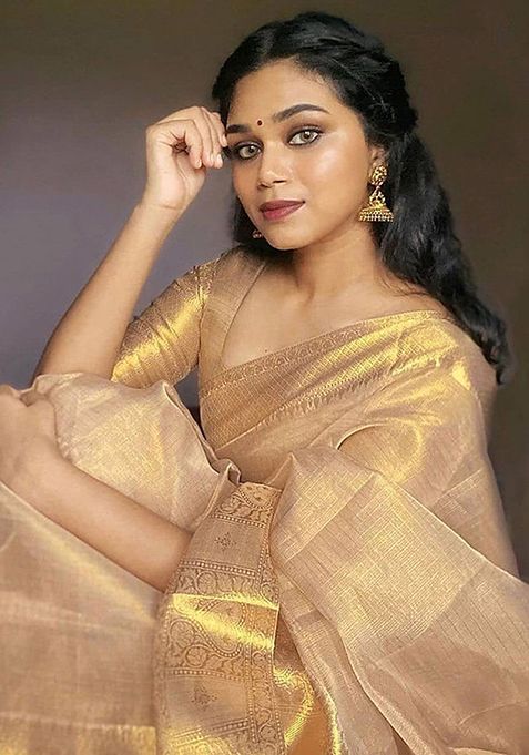 Beige Woven Tissue Saree Set