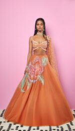 Brick brown tulle lehenga with embellished flower motif in neon glass cut beads, and sequins.