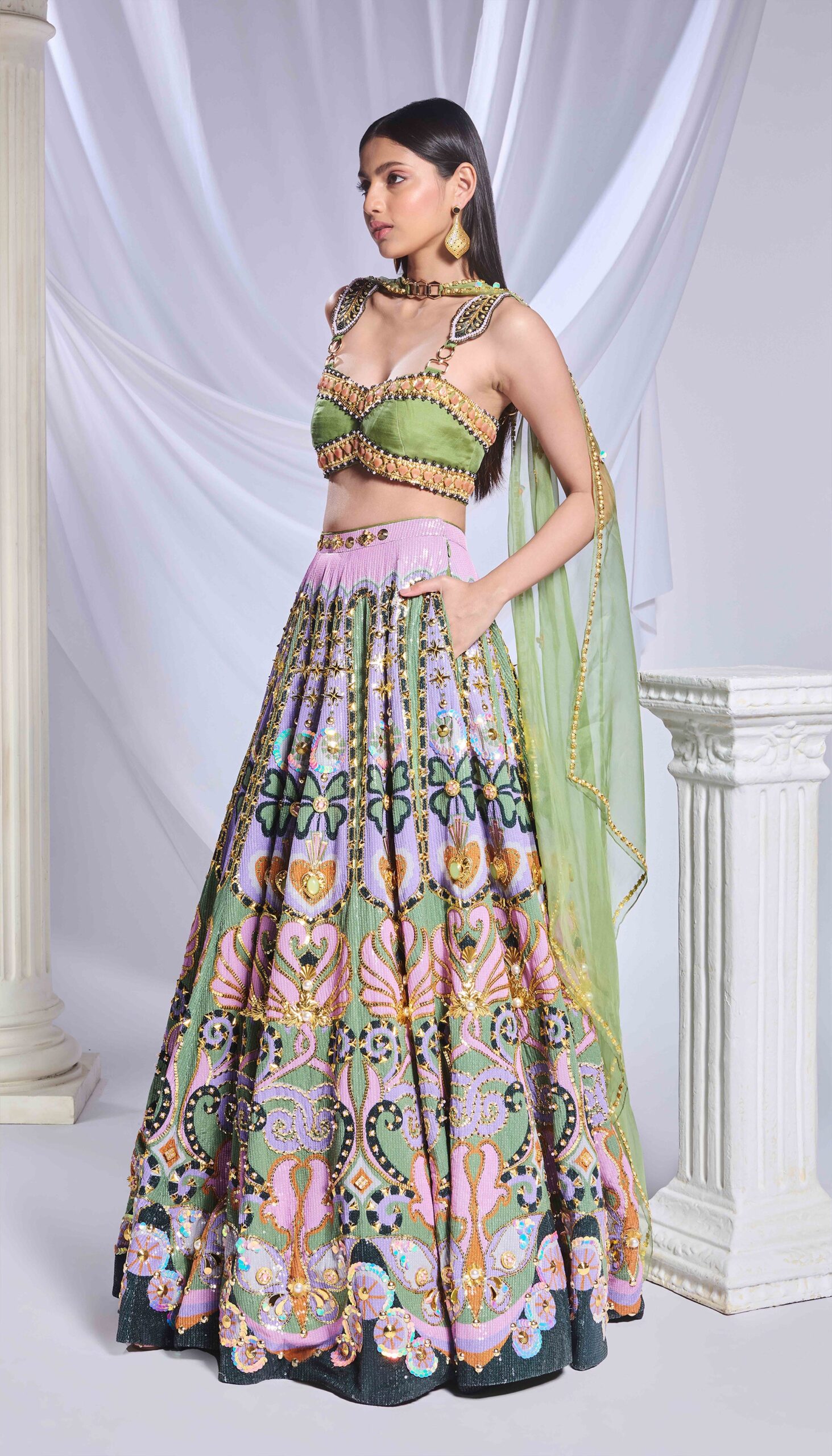 A green sequin-printed lehenga featuring pockets, adorned with gold chains, crystals, pearls and heart-shaped metal accents. It is paired with a green organza blouse, embroidered with gold chains, pearls, glass stones and beads, along with an asymmetrical organza dupatta with a pearl border and sequin scatter.