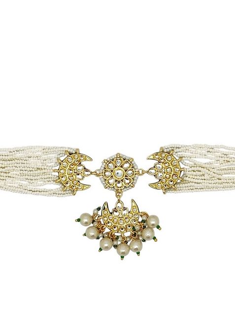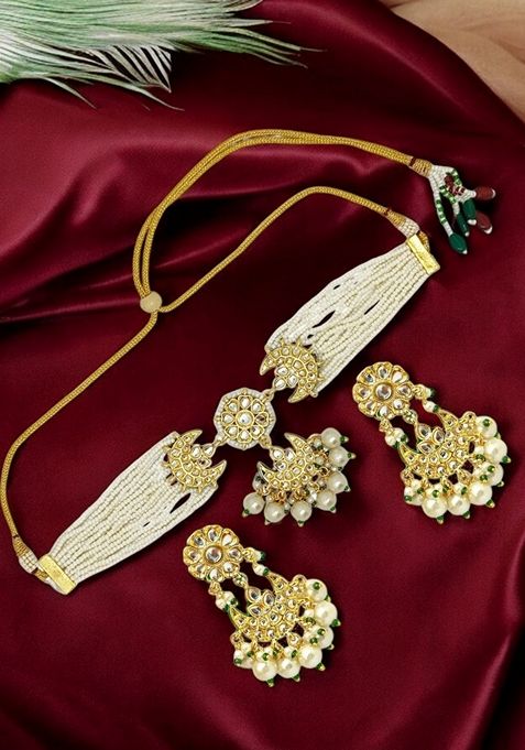 Kundan Gold Tone White Stone Studded Choker Necklace With Earring Maang Tikka