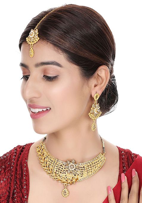Gold Plated Artificial Stone And Bead Necklace Set With Maang Tikka – XJS00744