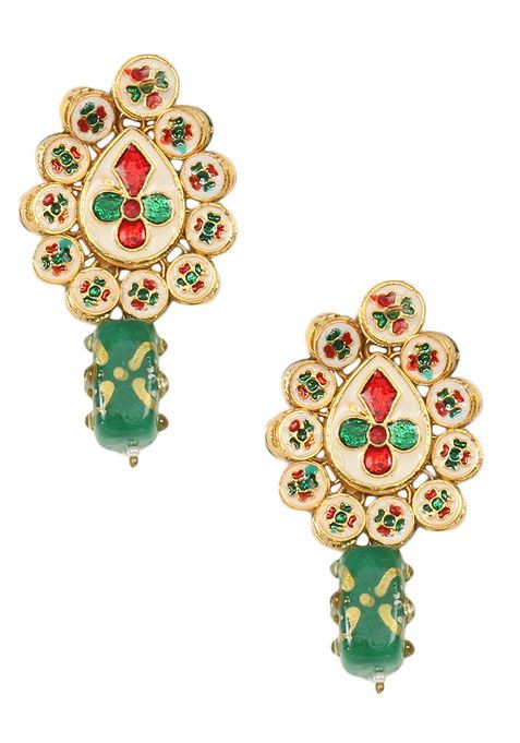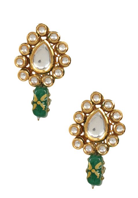 Home Jewellery Gold Tone Green Bead Kundan Earrings And Mangtika