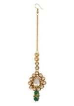 Gold Tone Green Bead Kundan Earrings And Mangtika