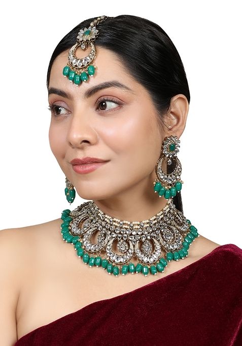 Gold Plated Artificial Stone And Bead Necklace Set With Maang Tikka