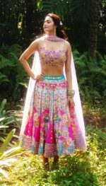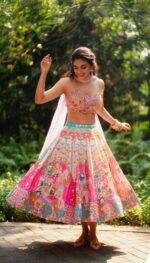 A vibrant multicolored sequin-printed lehenga with the added convenience of pockets! Adorned with rhinestone chains, delicate pearls, acrylics, crystals, and gold metal accents. Paired with our signature flower bralette with glass-cut beads, gold chains and crystals along with a soft pink tulle dupatta with an acrylic border and pearls to complete the ensemble.