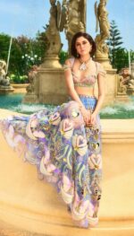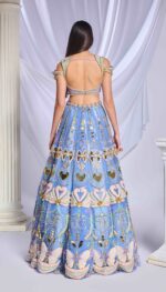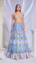 An elegant blue tulle embroidered lehenga adorned with patchwork, special cut acrylics, glass cut beads, pearls, gold chains, sequins and crystals, coupled with a fully embroidered blouse embellished with heart shaped chains, pearls, crystals and glass cut beads. This ensemble is complemented by a matching blue tulle dupatta with an acrylic border and scatters all over for a sophisticated look.