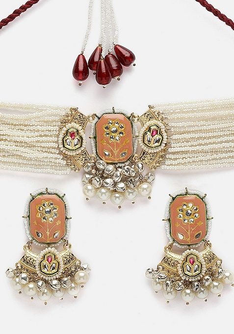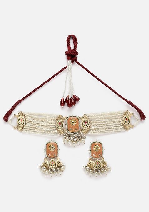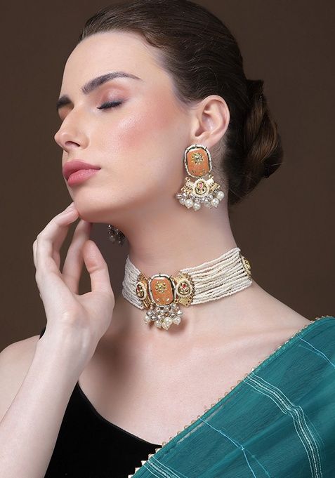Home Jewellery Orange And Silver Gold Plated Kundan Pearl Choker Necklace With Earrings Set