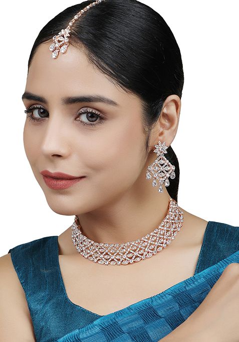 Rose Gold Plated American Diamond Necklace Set With Maang Tikka