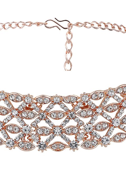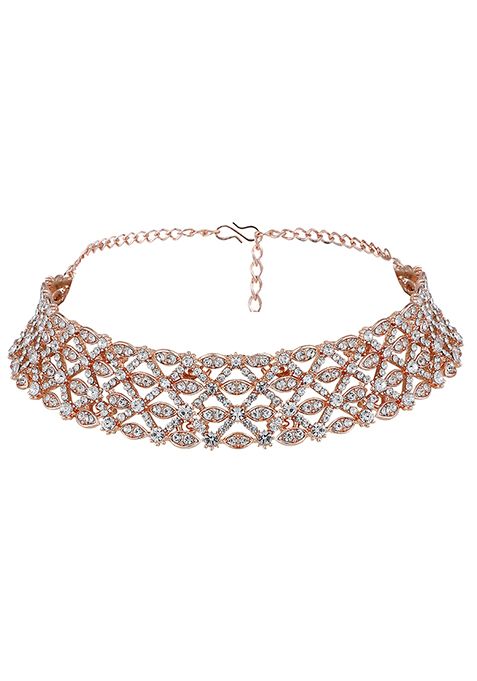Rose Gold Rose Gold Plated American Diamond Necklace Set With Maang Tikka