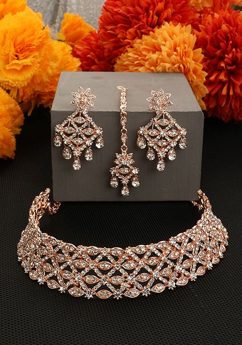 Home Jewellery Rose Gold Rose Gold Plated American Diamond Necklace Set With Maang Tikka