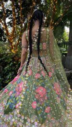 A custom shaded tulle lehenga in moss green embroidered with 3D flowers, glass cut beads, reflective sequins and evil eye beads. Paired with our original tab bralette in moss green – embroidered with glass cut beads – and an embroidered dupatta.