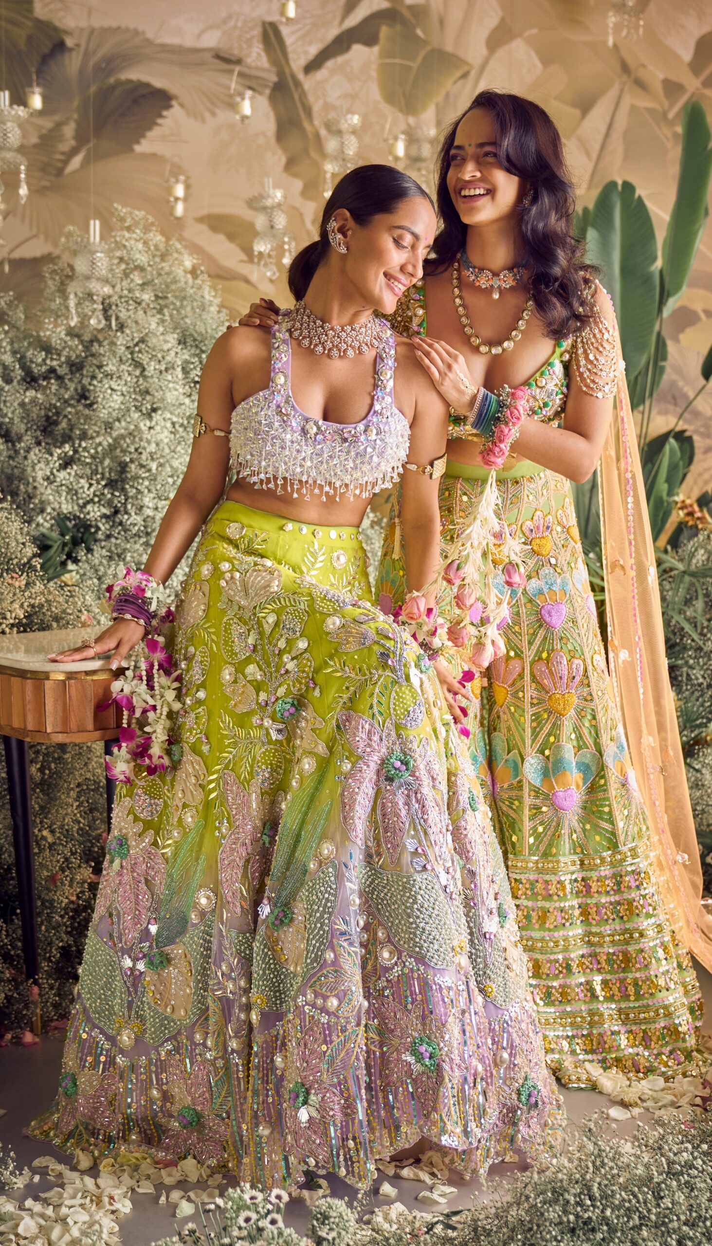 Is that love in the air? Presenting our Lime to Lilac Ombre Lehenga Set. The mesmerising ombre blend adorned with glass cut beads, crystal stones, pearls, and delicate floral appliqués. Paired gracefully with a glamorous tube blouse embellished with metals, sequins, and pearls. Complete the look with a shimmering, asymmetrical pre-stitched dupatta.