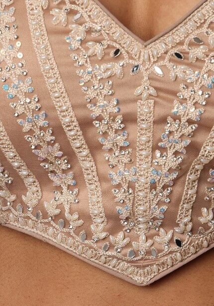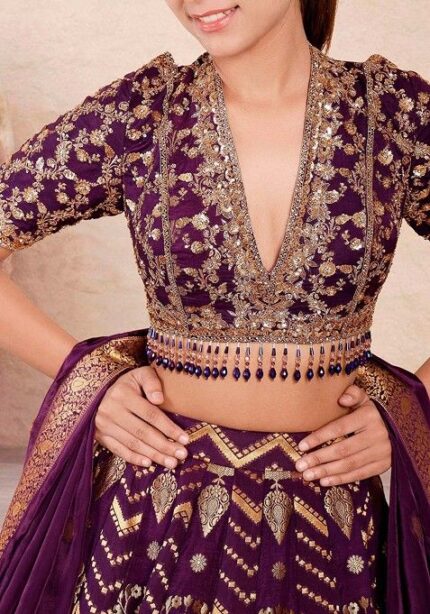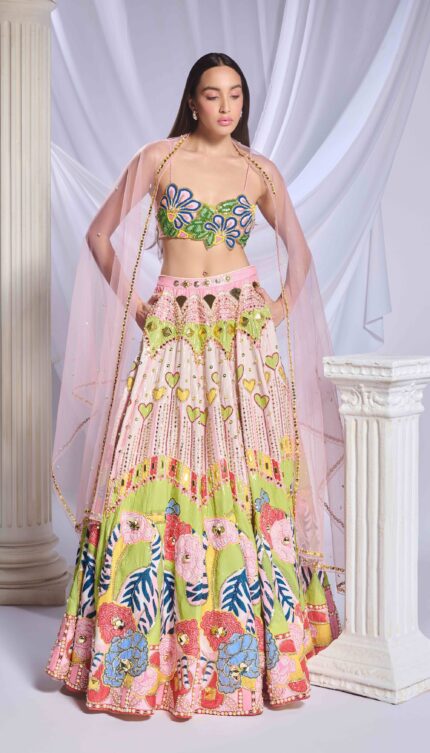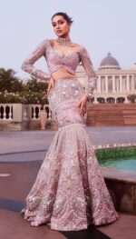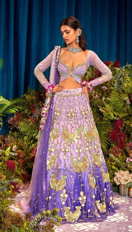 A 3-piece mermaid cut lehenga in lilac embroidered with silver metal embellishments, precious crystals, 3D flower and glass cut beads. This lehenga is completed with a waist side-cut covered with tulle and silver embroidered tassles Paired with a singature Papa Don’t Preach butterfly full sleeved blouse appliqued in lilac silks. This look is completed with a tissue organza embroidered dupatta in lilac.