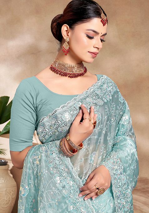 Home Sarees Sky Blue Sequin Work Art Silk Saree Set