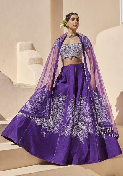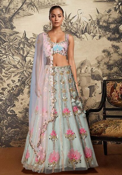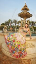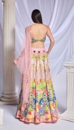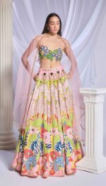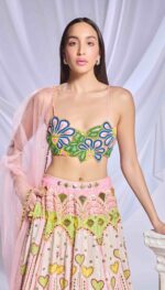 A vibrant multicolored sequin-printed lehenga with the added convenience of pockets! Adorned with rhinestone chains, delicate pearls, acrylics, crystals, and gold metal accents. Paired with our signature flower bralette with glass-cut beads, gold chains and crystals along with a soft pink tulle dupatta with an acrylic border and pearls to complete the ensemble.