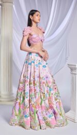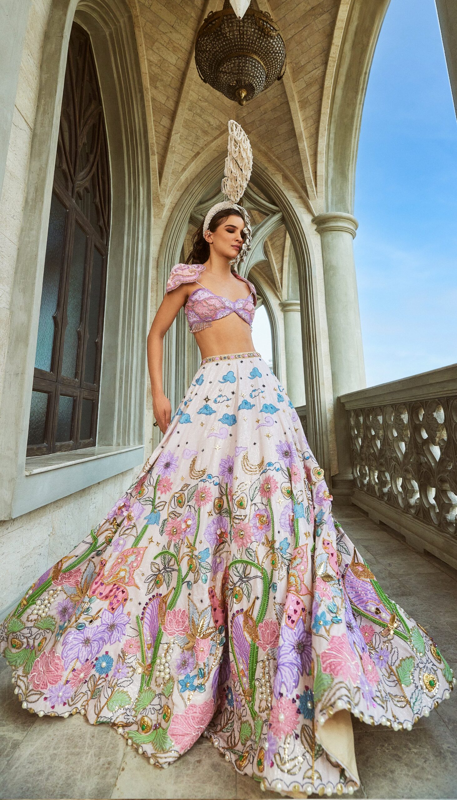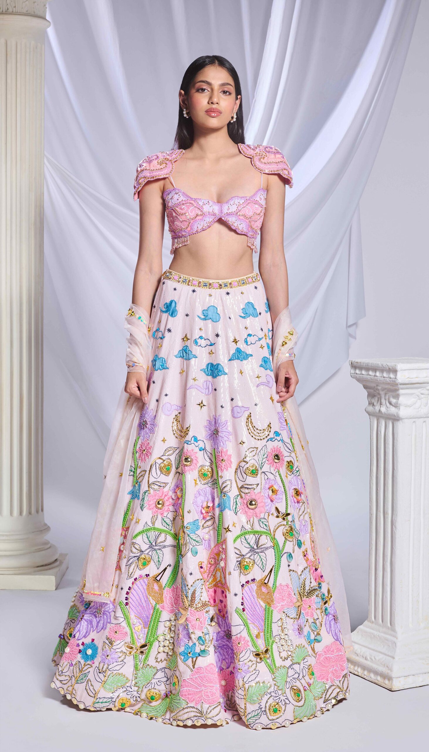 The Coloring Book-inspired lehenga features intricate patchwork that accentuates the symbols and motifs of clouds and stars with metal embellishments and pearls, complete with pockets. Paired with a tube blouse, made of a patchwork of fabrics in the shape of clouds with an embroidery of glass cut beads and sequins; accompanied by an ivory organza dupatta.