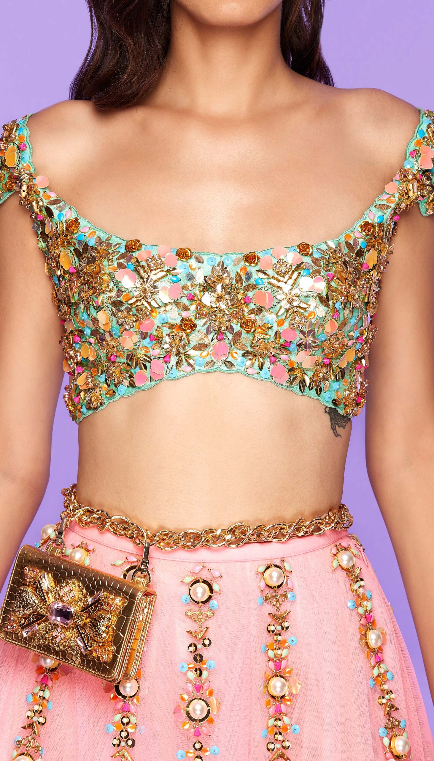 A tulle Lehenga in candy pink embellished with glass crystals, metals, pearls and sequins. Paired with an embellished mint off shoulder blouse and pink tulle dupatta